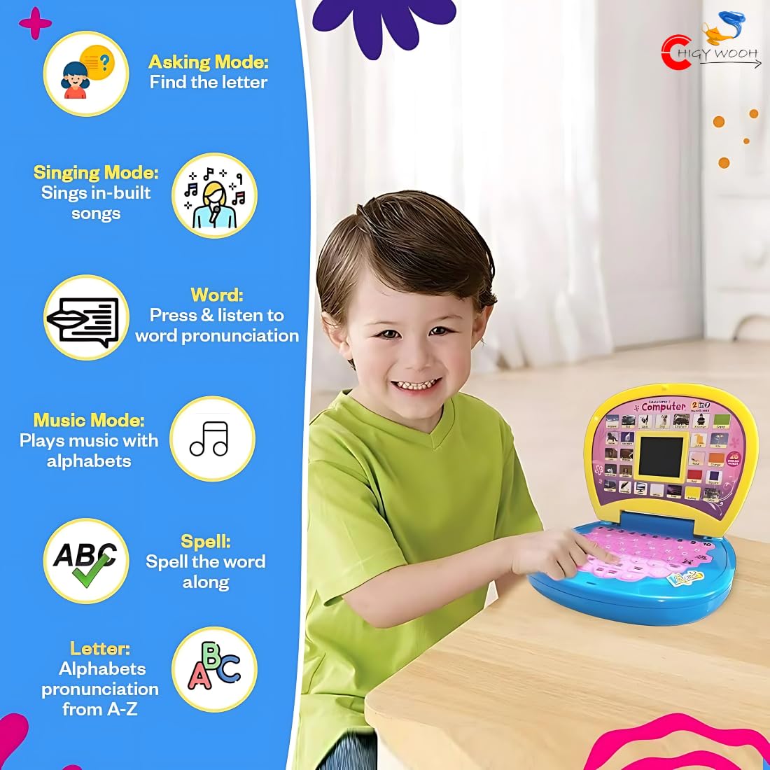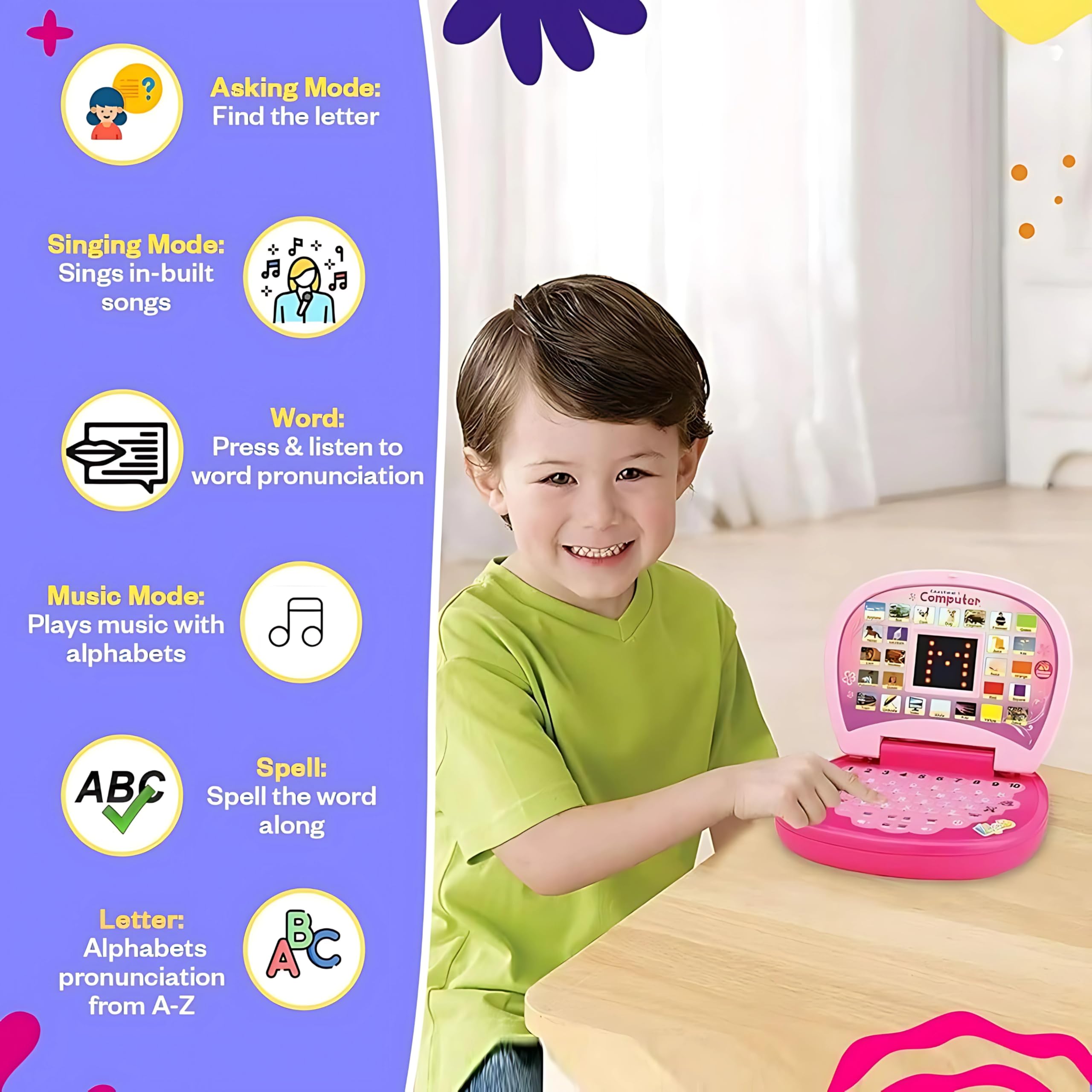 The learning laptop is an educational toy which helps children learn the pronunciation of letters, numbers and it also helps children learn various songs and keeps them away from mischief. The learning laptop has many functions like letter mode, asking mode, singing mode and music mode which ensures kids have a good time playing with it and also enjoy learning new things.