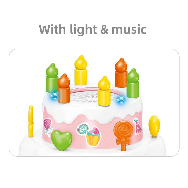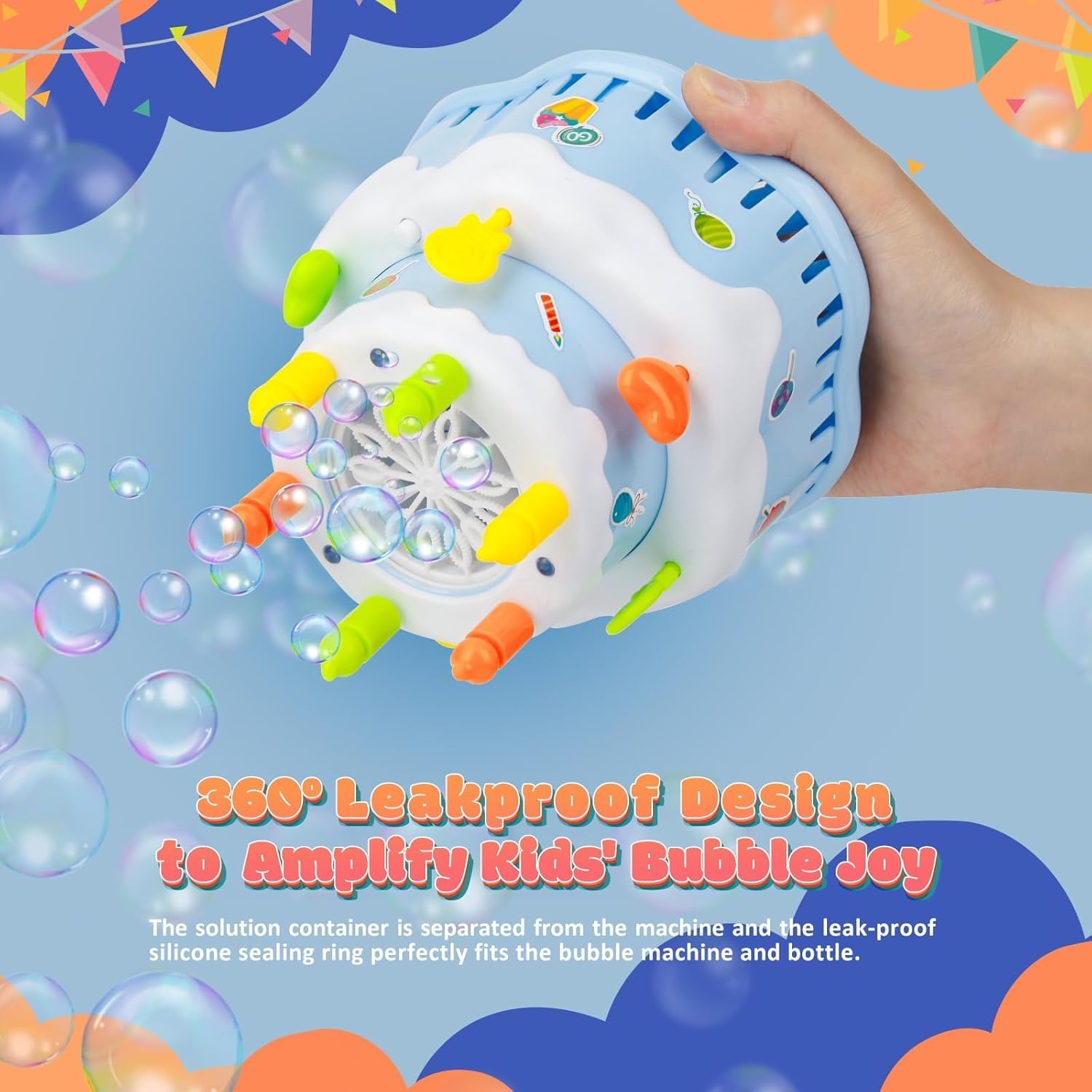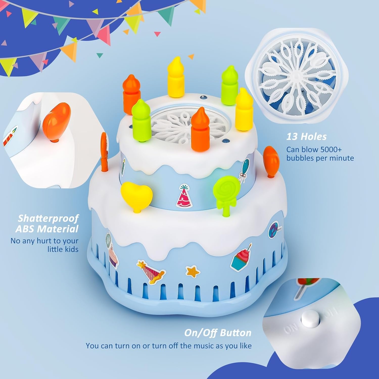 Charming birthday cake-shaped bubble machine with decorative elements including candle models and creative stickers With just one click to start bubbles will burst out every minute. The colorful bubbles will create a dreamy atmosphere. LED lights make the cake bubble machine glow at night, and the crystal bubbles are also sparkling under the light. Kids will love it so much. Music can be controlled on/off, and starting from different scenes create different atmospheres, it is also a very suitable preschool toy for toddler. Simulated cake with exquisite decorations. It's so cute. Such a cute bubble machine is an excellent gift for weddings, birthdays, parties for 3+.