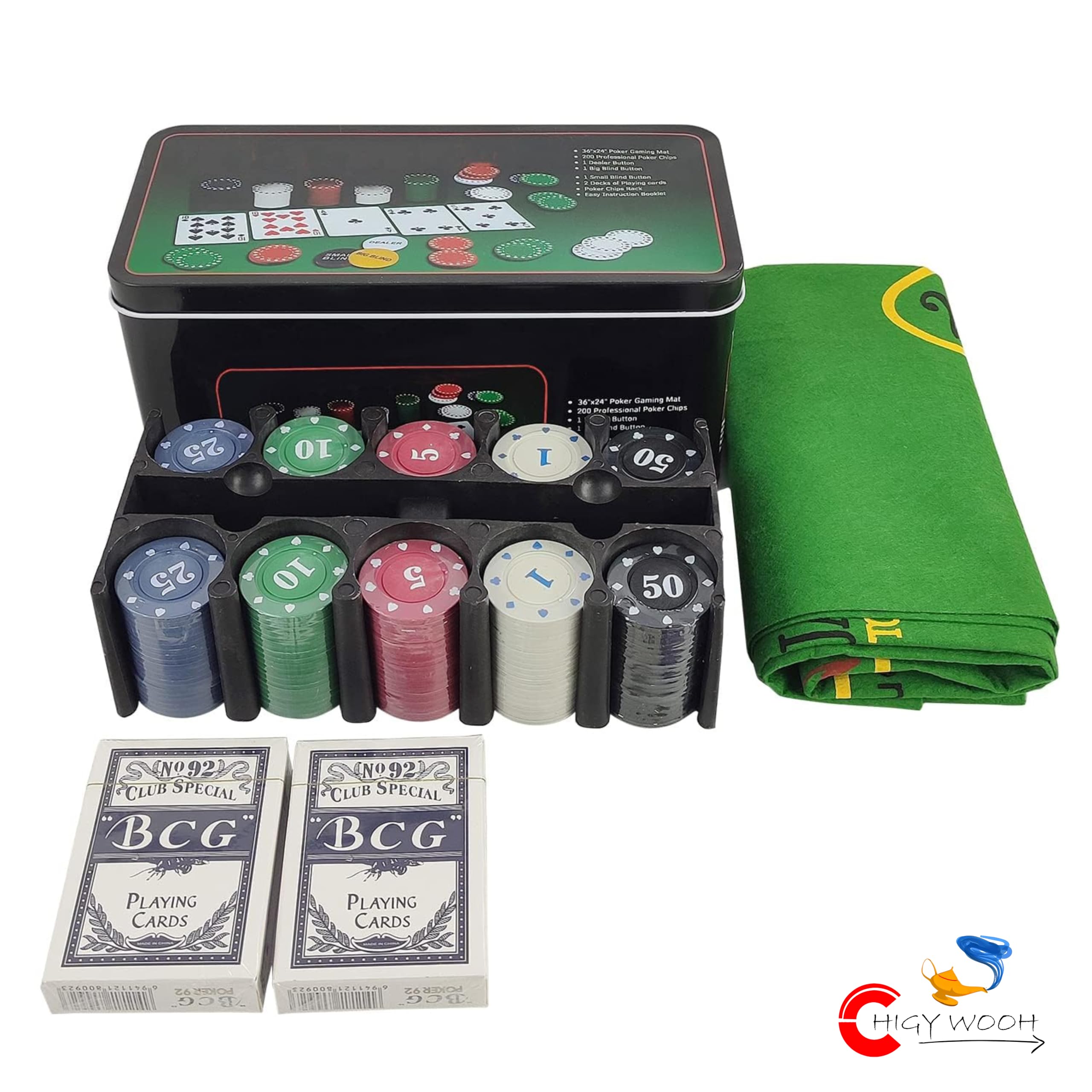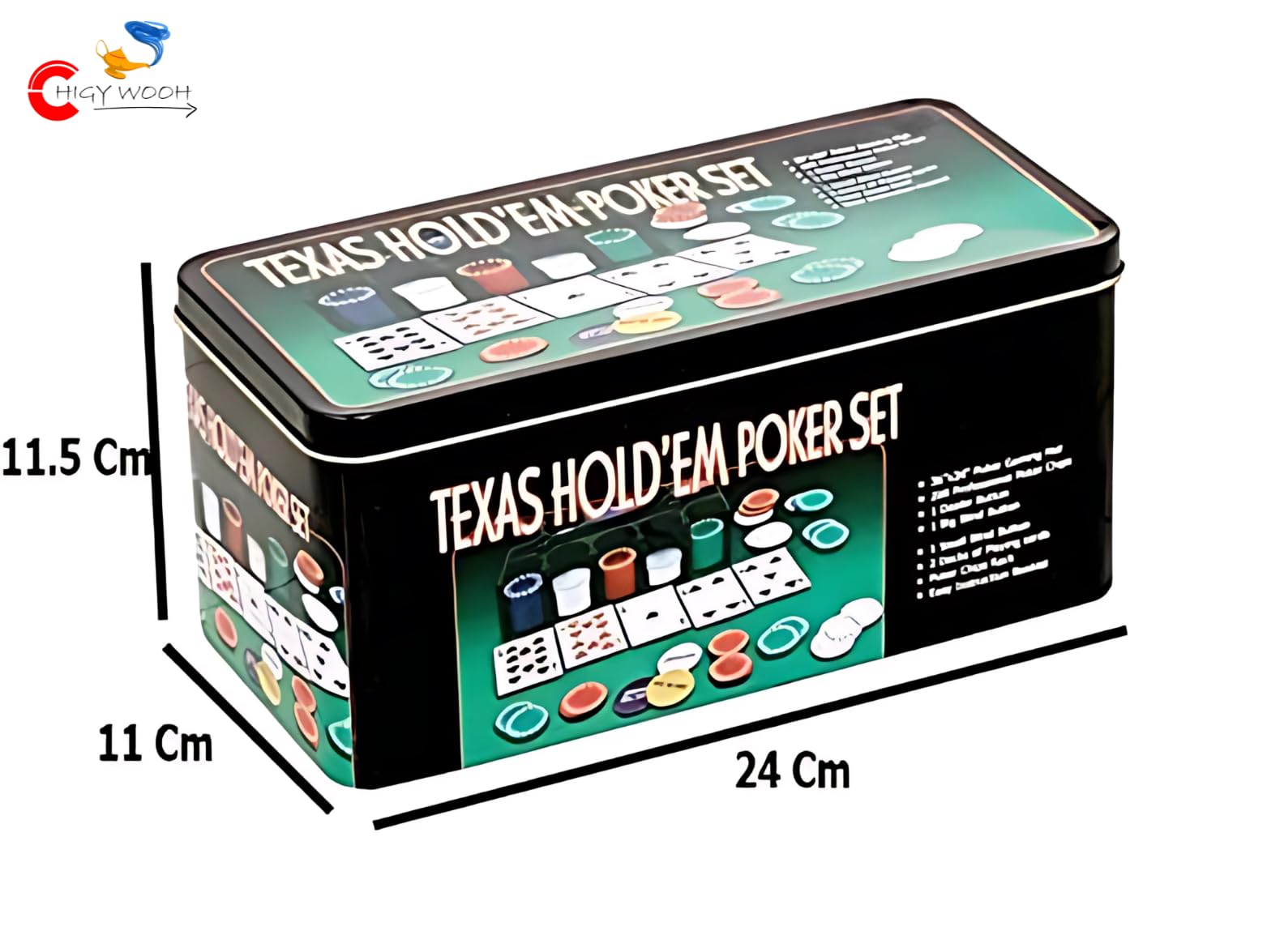 This kit comes with everything you need to fuel hours of texas hold'em fun: 2 sets of cards, a mat, gambling chips and a plastic holder for the casino chips. Every hold em set comes in a cool tin box. This means you can neatly store the accessories in one place for safe-keeping and easy access, and easily travel with your set whenever you head out on vacation or go out camping.