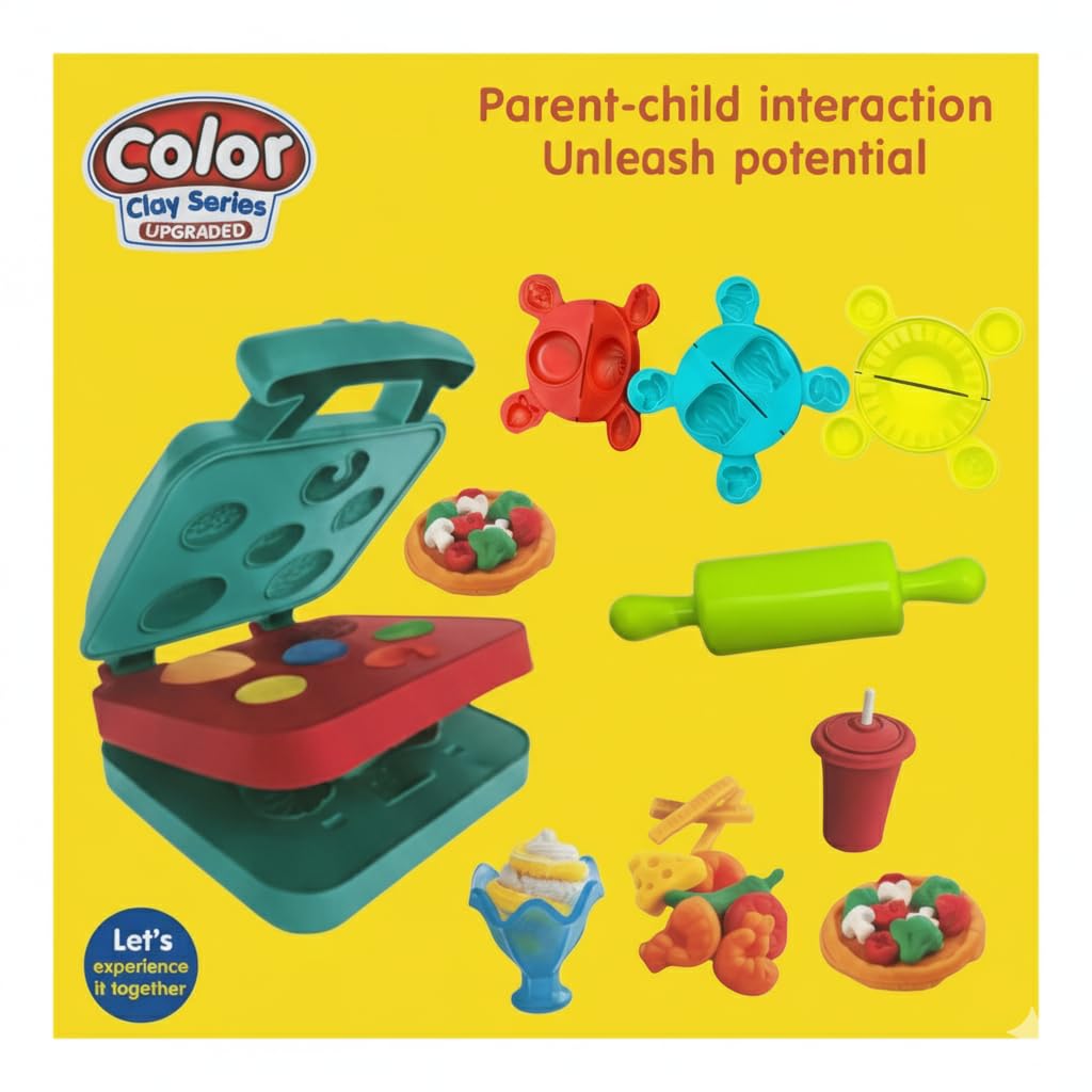 Color Clay Series play set, which encourages parent-child interaction and helps unleash potential. The set includes a waffle-press style machine for shaping clay, along with various molds and tools like a rolling pin. It appears to be an upgraded version of the original set. The set is designed to be a fun, hands-on activity for kids and parents to enjoy together.