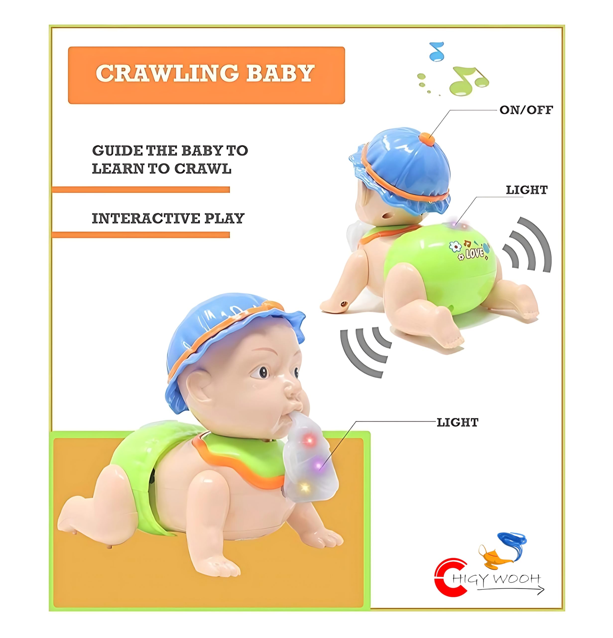It's a baby Crawling Baby toy, it produces melodious sound and beautiful lights from the cap and milk bottle. A perfect light and musical Crawling Baby toy toy for babies and infants (6-24 months), toy should be used under adult supervision. This colorful and cute Crawling Baby toy crawls, laughs and sings. Your child will enjoy playing with it for hours. This colorful and cute baby toy crawls, laughs and sings. Your child will enjoy playing with it for hours. The toy encourages ability training, interest development, emotion, hearing, grasping, sensory, Vision and other abilities. Crawling Baby toy is a Perfect Toy light and musical toy for babies and infants (6-24 months), toy should be used under adult supervision