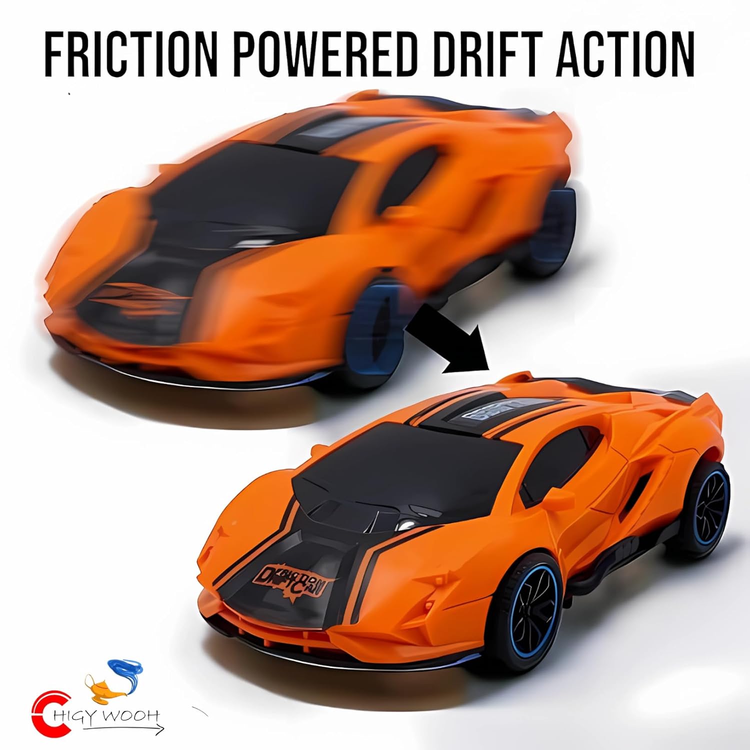 This friction powered drift racing car provides hours of fun as kids power it across floors and surfaces using only the force of friction with realistic car styling and drift racing inspired design, this toy will spark kids' imagination as they drift and race like the pros. imply push and glide the car to enjoy friction powered drifts and races without the need for batteries or charging.