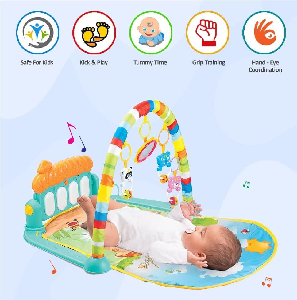Multi-function piano baby gym and fitness rack, Music rewards baby as he/she kicks the piano keys With movable musical piano keyboard can attach baby's attention and have fun. Play Gym is 100% safe and non- toxic for your child and is suitable for 6-36 month old baby , soft cloth mat with cute cartoon pendant with a multi colored piano which attracts baby's attention Four ways to play : lay & play; Tummy time; Sit & play; Take-along.