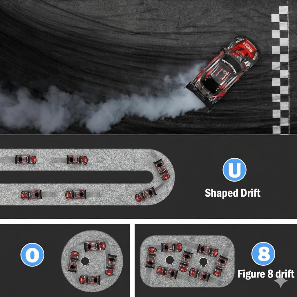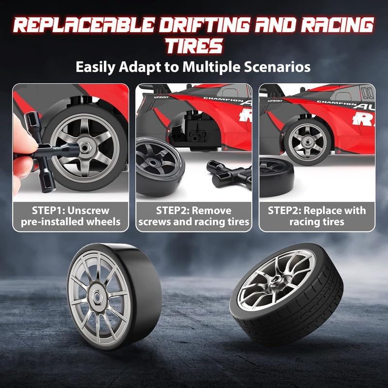 Chigy Wooh toy car is equipped with an easy-to-use remote controller with 2.4GHz frequency making the car run multiple cars at the same time without interference, which is more convenient for you to play racing with your friend When you want to show off this high-speed rc car with stunts, you can drift on smooth boards, tiles, tracks with better handling and perfect agility, and when you want to make it a sports car, the racing tires will be your nice choice RC car comes with 4 blocks, in the process of playing the remote control car, add unlimited fun to you and children, let's become a professional driver together; RC sport car is a nice toy for boys, girls and adults Fast RC Car With a 4WD system, it composed of a tough PVC shell and strong ABS base, which is resistant to collision and suitable for a variety of venues and environments; Drifting car equipped with bright LED lights, light up the track in the dark