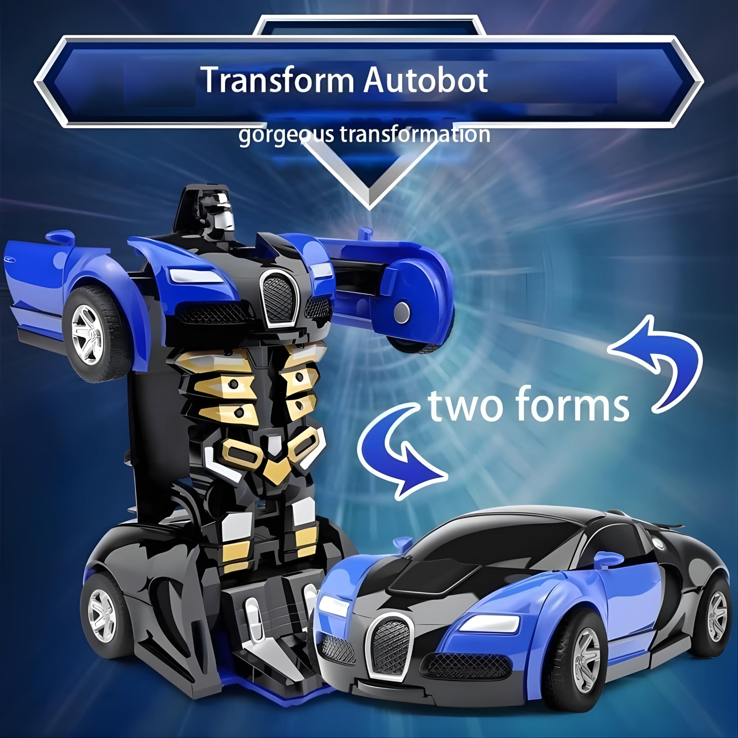 Robot Races Car Toy 2 in 1 Convertable Car Toy When turned on, the flashing lights will emit bright colors from the headlights, the sirens and the taillights, the dynamic flashing of the bright colors is more appealing to the children and beneficial for their color recognition capability. Realistic engine sounds and chasing sounds: the toy brings excitement from every angle. After turned on, the small robot car starts running with realistic engine sounds, chasing sounds and weapon tick sounds. It will bring your kids endless fun. After turning on the single switch, this cool racing cars will not only start running and chasing, but also auto transforming into the robotic action figure, with lights and sounds everywhere, it will surely get your kids excited. The colourful cars will keep your child's attention and leave them having endless fun, wind up the toys and let them zoom right past your child as they laugh and smile trying to chase the cars. The best Product to gift your loving kids.