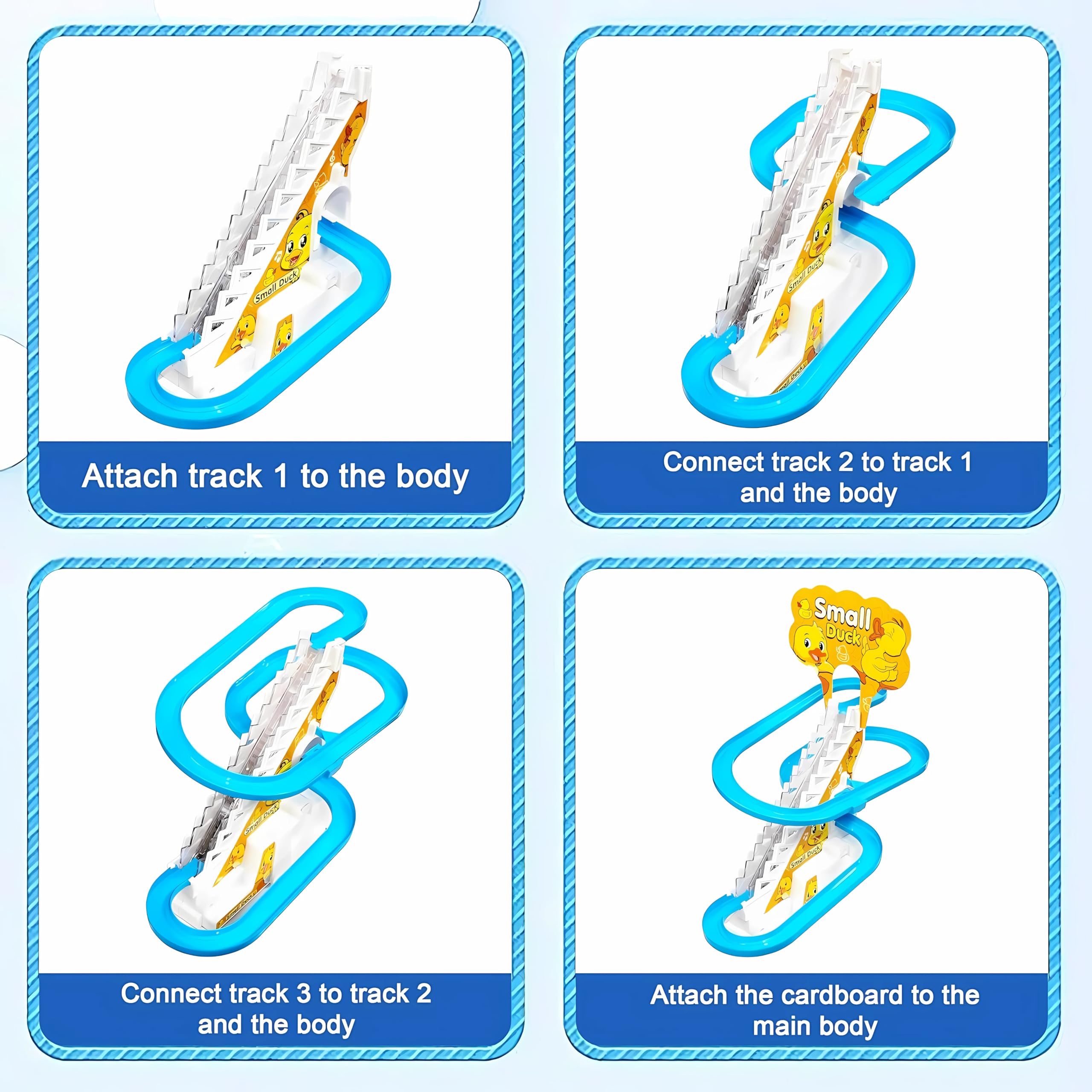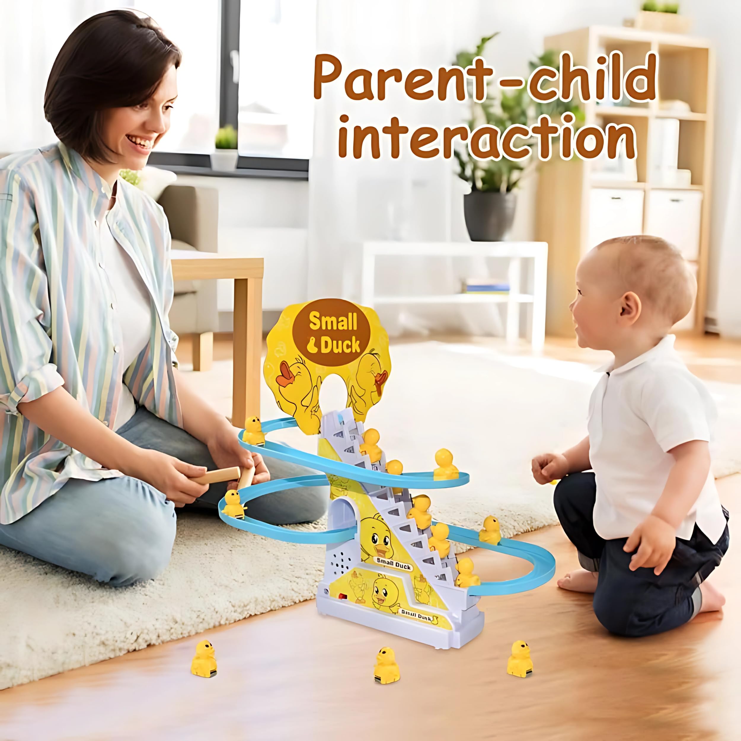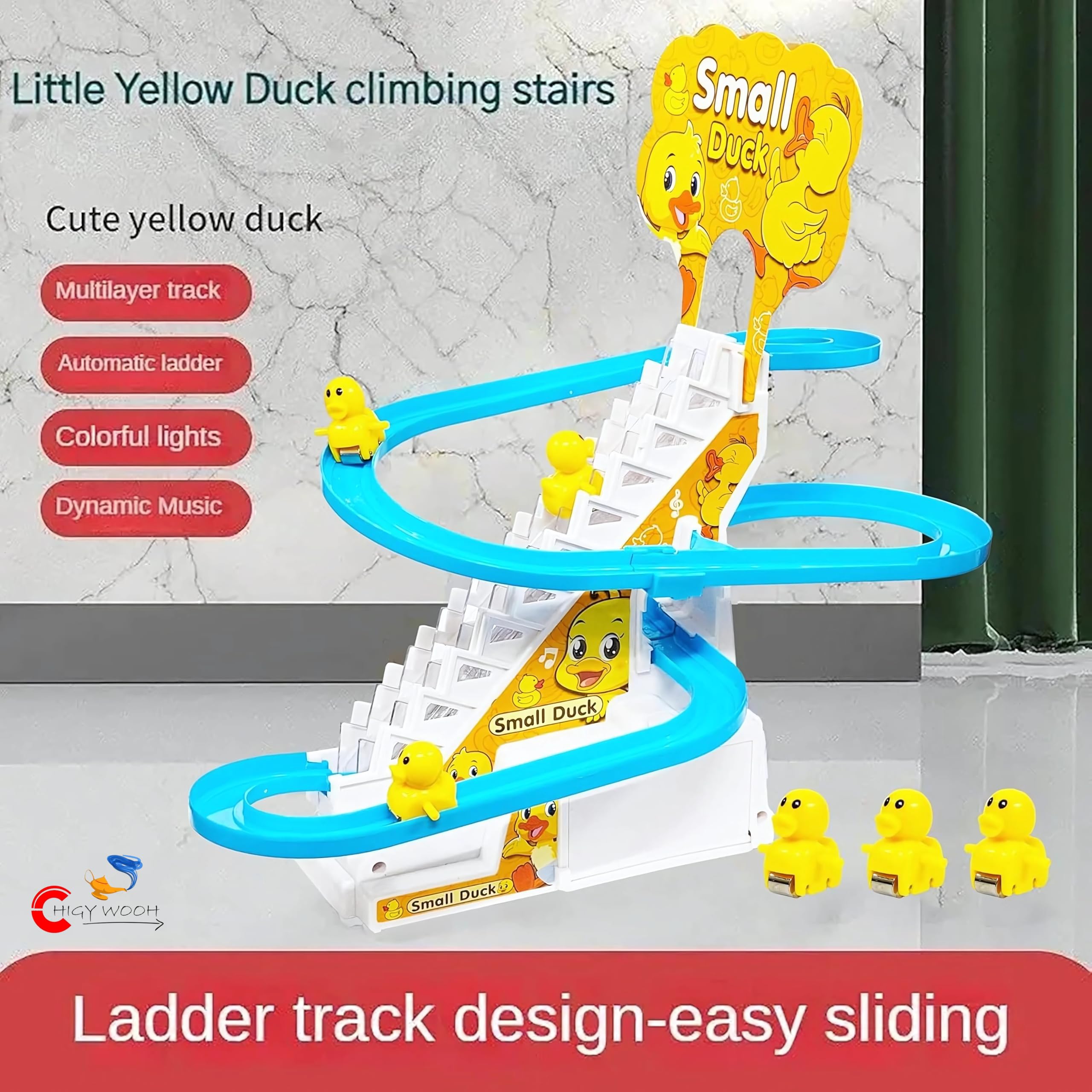 Climb The Stairs Automatically: There is a mechanism inside the main part of the toy that enables the stairs part works like an escalator. The lovely ducklings will be sent to the top just like they are taking the escalator. Ending Point is Starting Point: With the escalator-like mechanism and the sliding tracks, these little ducks will back to the starting point automatically after sliding down. Therefore, it can keep working until you stop it. Music & Light Function: Dynamic music will sound and shinning lights can be seen as the toy starts working, which makes the toy more funny and attracts kids' attention more easily.