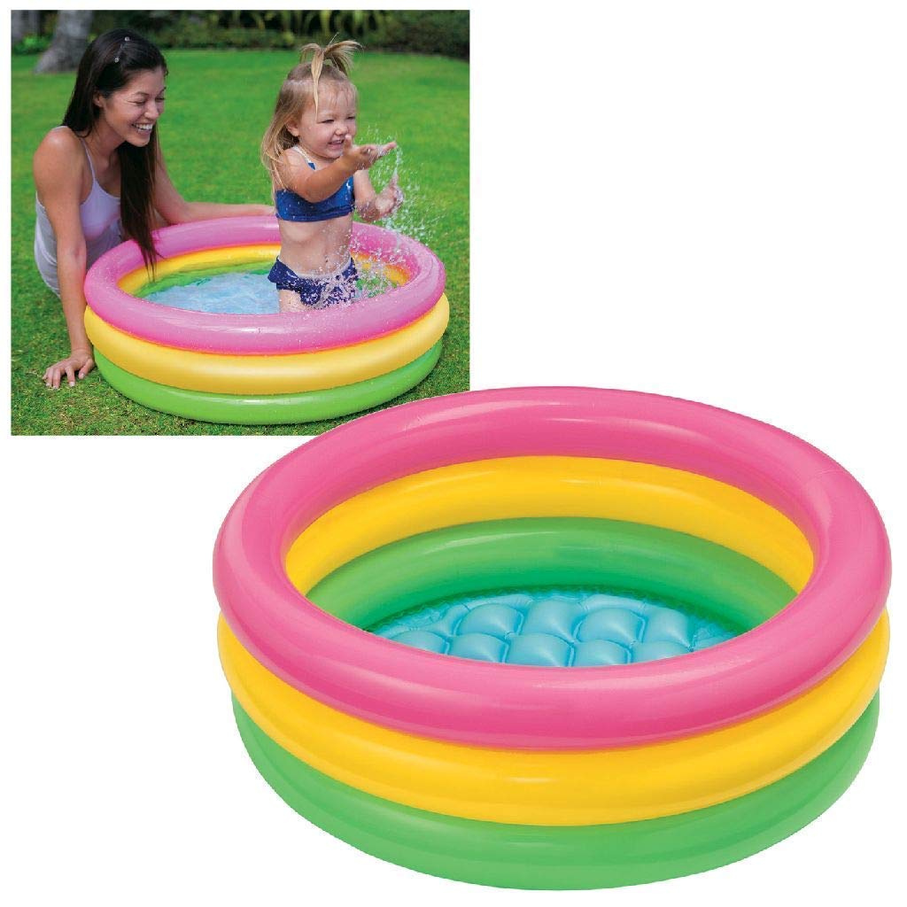 Summer Special 2 feet Inflatable Baby Bath Tub for Kid Swimming Pool Water Pool for Kids This is a kids’ inflatable pool made from plastic. It has a round shape with three colorful inflatable rings around the sides in pink, yellow, and green. The bottom of the pool is blue and appears to be soft and cushioned making it more comfortable for children to sit or play in pool is lightweight, easy to inflate, and designed for outdoor water play.